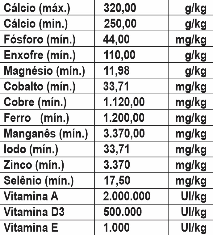 Misturar 1 kg em 25 kg de sal comum ou mineral.